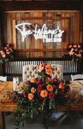 The floral color pallet was jewel tones of crush orange, merlot, burgundy and deep purples. The chapel alter florals were moved to the reception to be placed behind the head table. The guest tables were lined with greenery table runners with flowers sprinkled throughout.